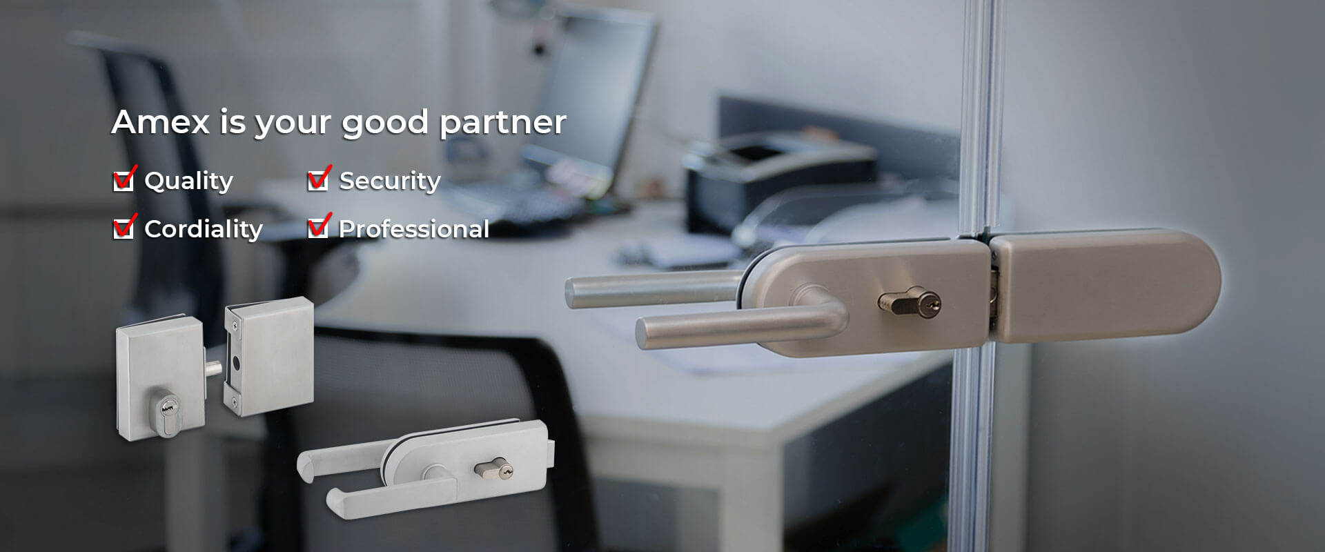 Amex is one of the leading and reputable manufacturers and exporters of door and window locks and accessories (security products) in Taiwan/China since 1979. Our products include door locks, slam locks, padlocks, door closer , door guards, door hinges, cylinders, pivots, patch fittings, dead bolts, combination safe box lock, cam locks, car locks, rollers, glass door fittings, caulking guns and building hardware.